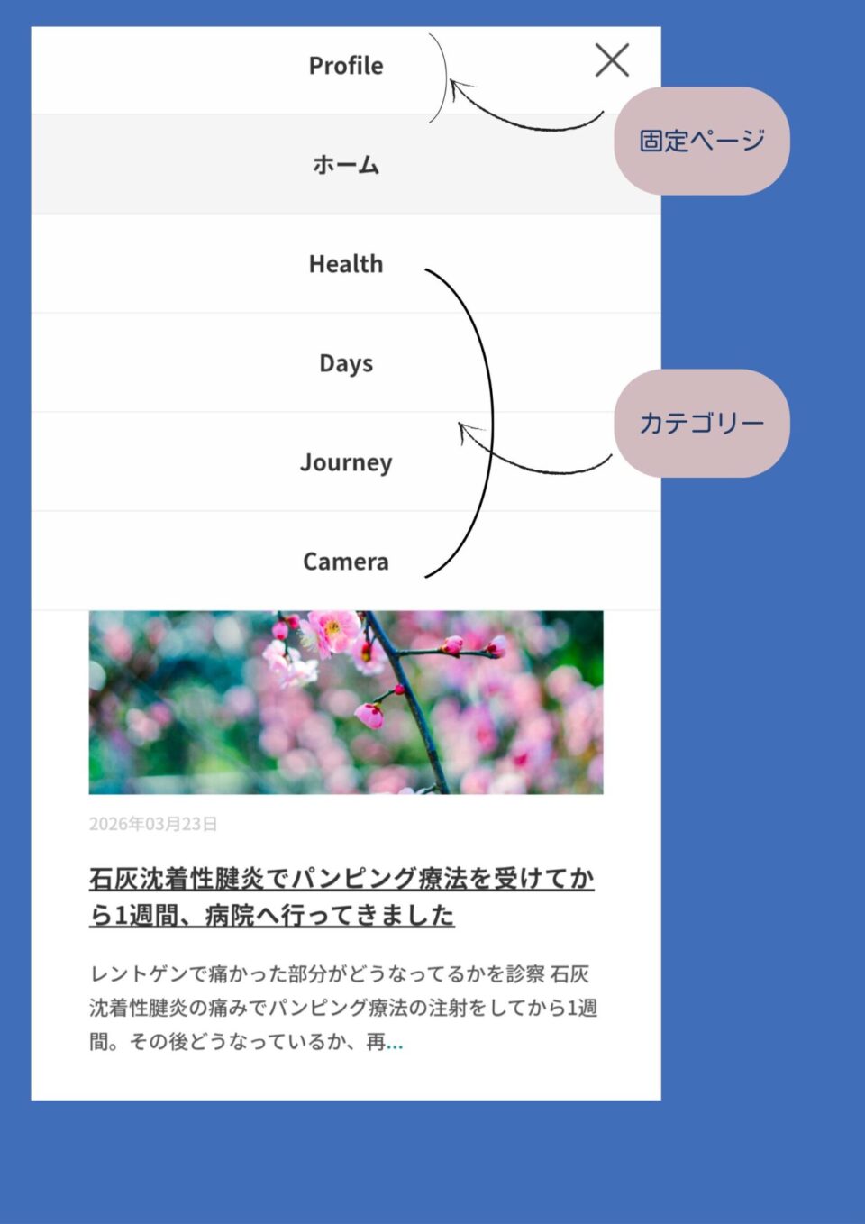 固定ページはプロフィールなど、変えることがないもの(見た目はカテゴリーと同じ)